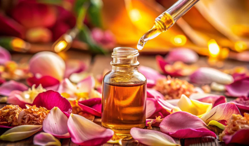 Eine entspannende Szene mit duftenden ätherischen Ölen, die in einer Schale nebeneinander angeordnet sind, umgeben von frischen Blütenblättern und warmem Kerzenlicht, das eine beruhigende Stimmung vermittelt